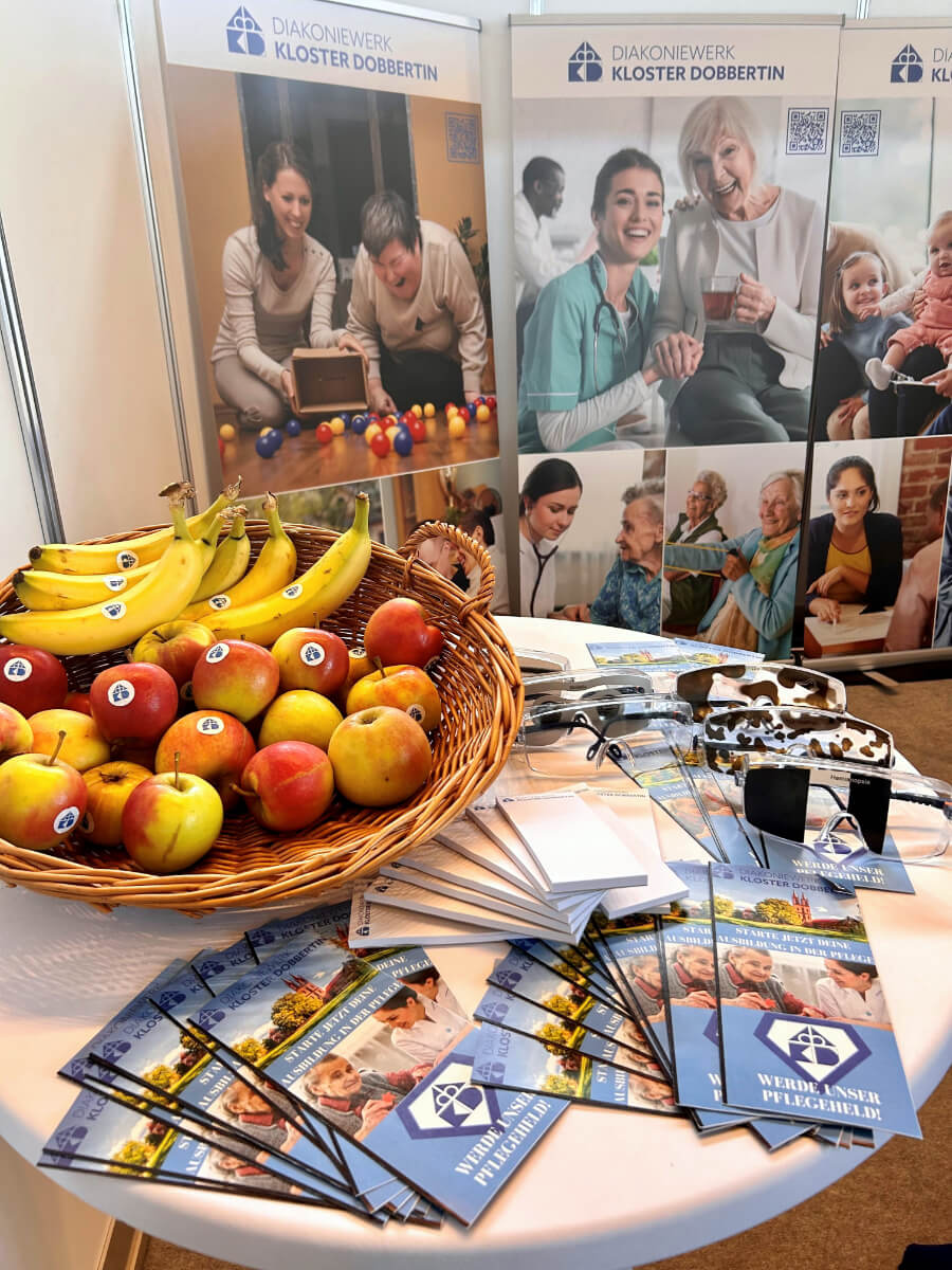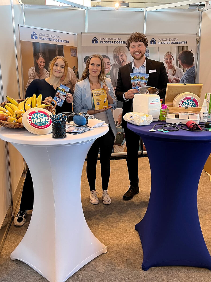 Am 15. und 16.09.2023 fand die Jobfactory in Rostock statt. An der größten Ausbildungsmesse im Land nahm auch das Diakoniewerk Kloster Dobbertin teil. An 2 Tagen kamen interessierte Jugendliche, junge Erwachsene, Eltern und Lehrer mit Lisa Peinemann (Auszubildende), Laura Schuster (Praxiskoordinatorin), Lars Krychowski (Einrichtungsleiter) und Ulf Röding (Personalleiter) in spannenden Gesprächen über die verschiedenen Karrieremöglichkeiten im Diakoniewerk Kloster Dobbertin zusammen.