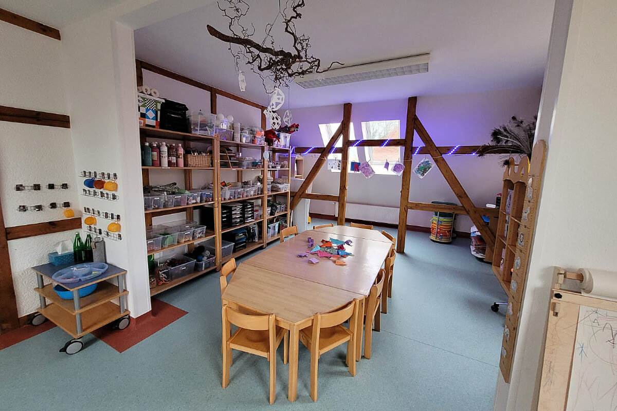 In einem großzügigen Bauraum und in einem hellen Atelier, welches zum kreativen Gestalten einlädt, werden die Kinder dazu angeregt, sich ihre Umwelt ganzheitlich zu erschließen – sie malen mit Farben und nutzen dazu auch mal die Finger und Füße, sie gestalten mit Spießen Indianerzelte und bauen im Bauraum meterlange Murmelbahnen. Ihrer Kreativität ist keine Grenze gesetzt.