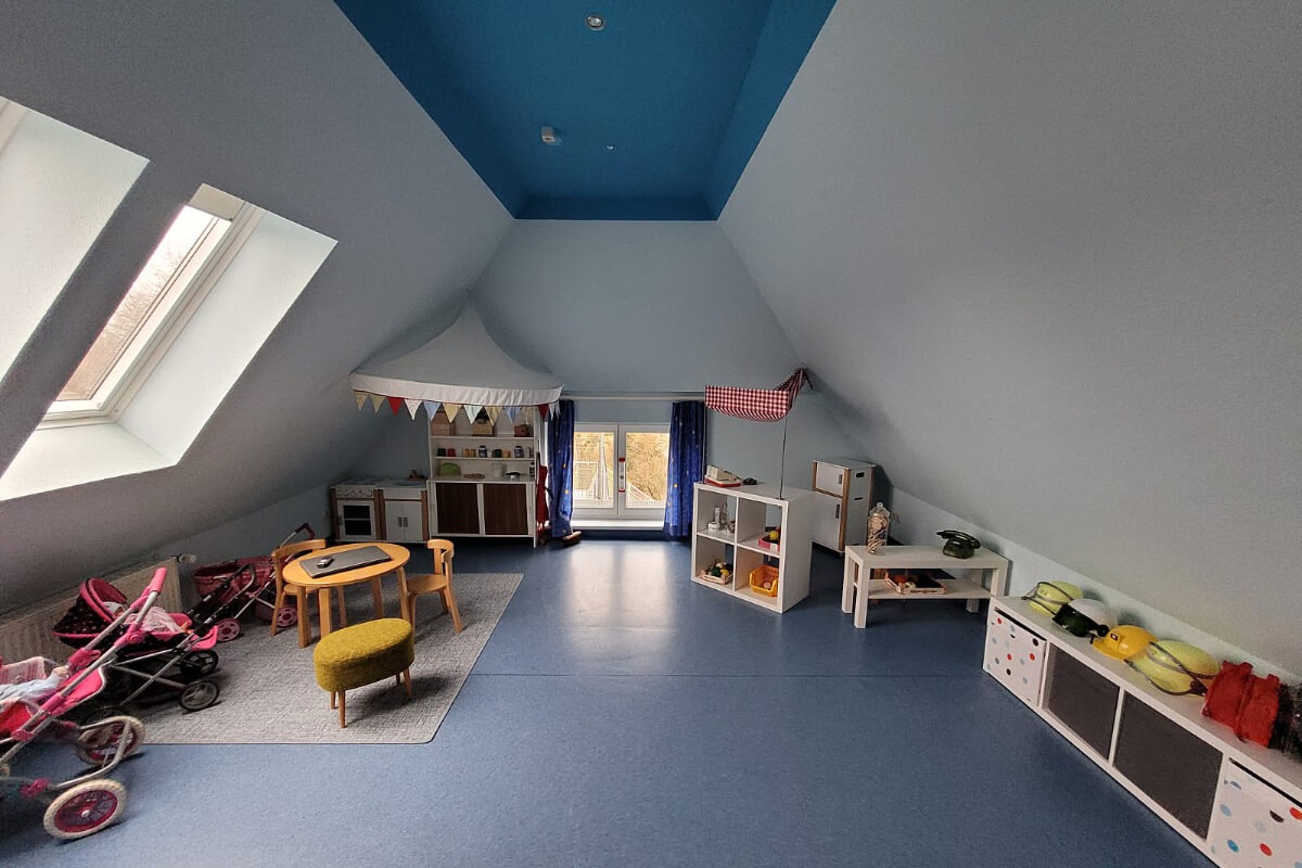 Unsere Stadtvilla überzeugt mit altertümlichem Charme. Die Lernräume für die Jungen und Mädchen unserer Kita bieten ausreichend Platz zum Lernen und Spielen.