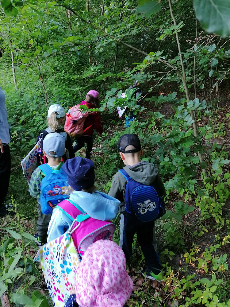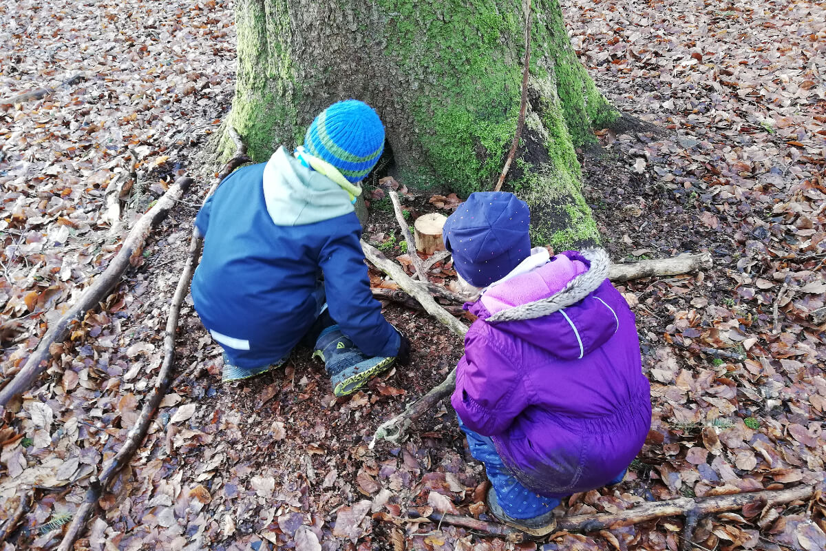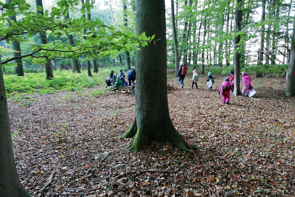 Der Wald bietet einen großen Lern- und Spielplatz für die Jungen und Mädchen unserer Einrichtung. Bei unseren wöchentlichen Ausflügen in den Wald findet ganzheitliche Bildung mit allen Sinnen statt – es werden Waldtipis gebaut, Niedrigseilgärten errichtet oder Landart gestaltet. So werden nach und nach immer mehr kleine Waldspielplätze durch die Kinder im Lübzer Wald errichtet und regen sie zu phantasievollem und abwechslungsreichem Spiel an.