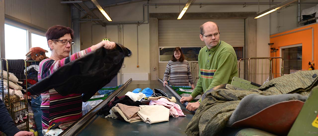 In unserer Betriebsstätte in Lübz können Menschen mit Behinderung unter anderem in der Tischlerei, bei der Altkleidersammlung und Sortierung und in der Putzlappenschneiderei arbeiten.